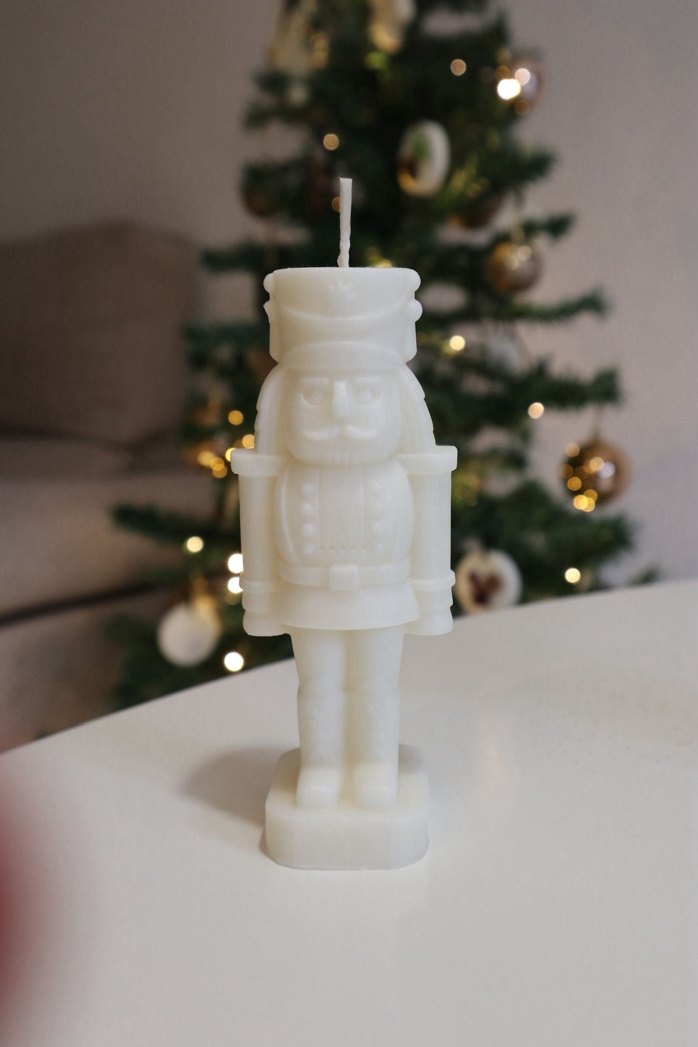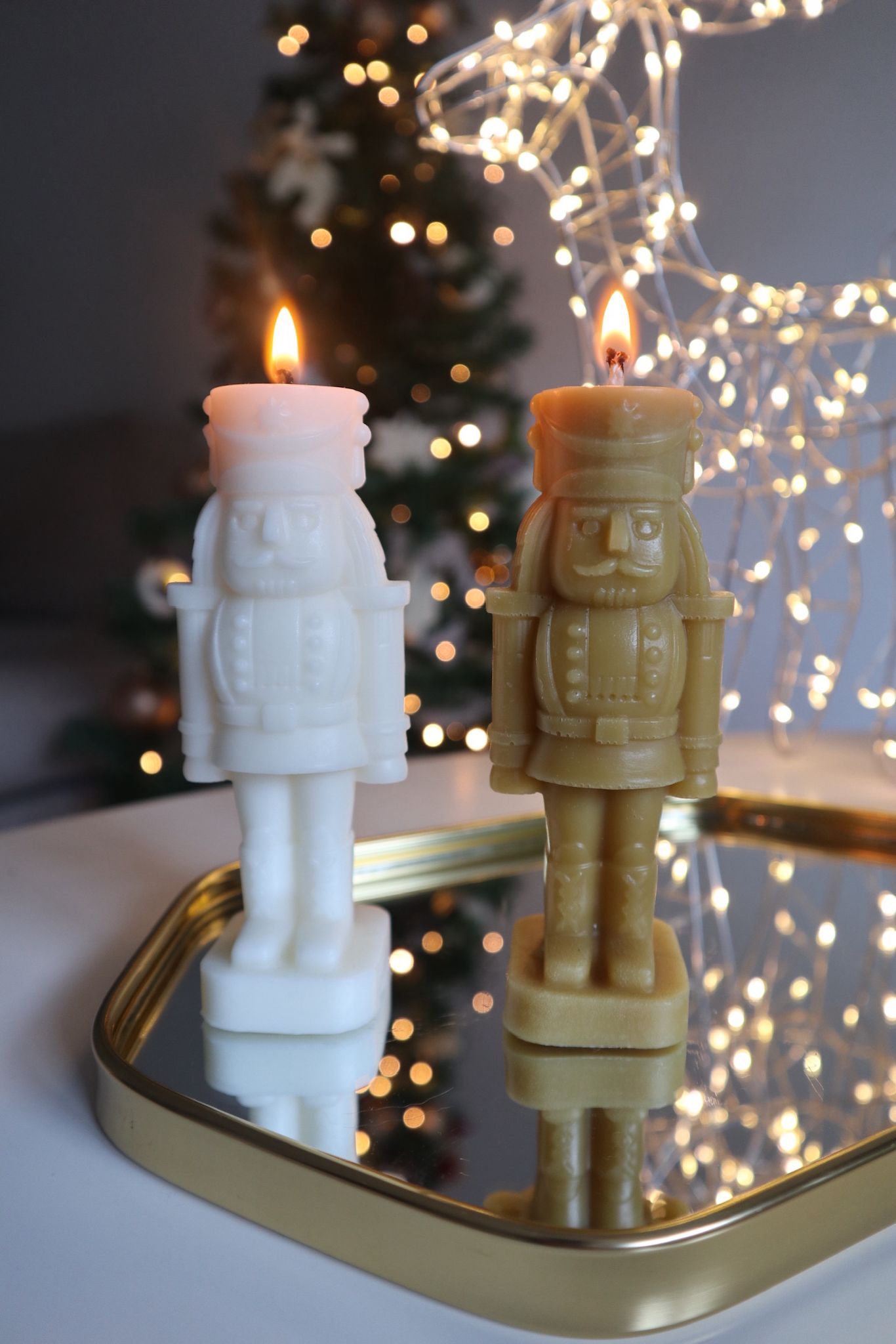 Vela decorativa elaborada en cera de soja o cera de abeja en forma de cascanueces.
